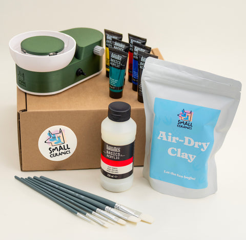We’ve designed this bundle to allow new potters who may not have access to a full kiln to be able to start straight away, however all our bundles are customisable, and a good way to save! Included is premium air-dry clay, an acrylic paint set, gloss or matte varnish, and acrylic brushes